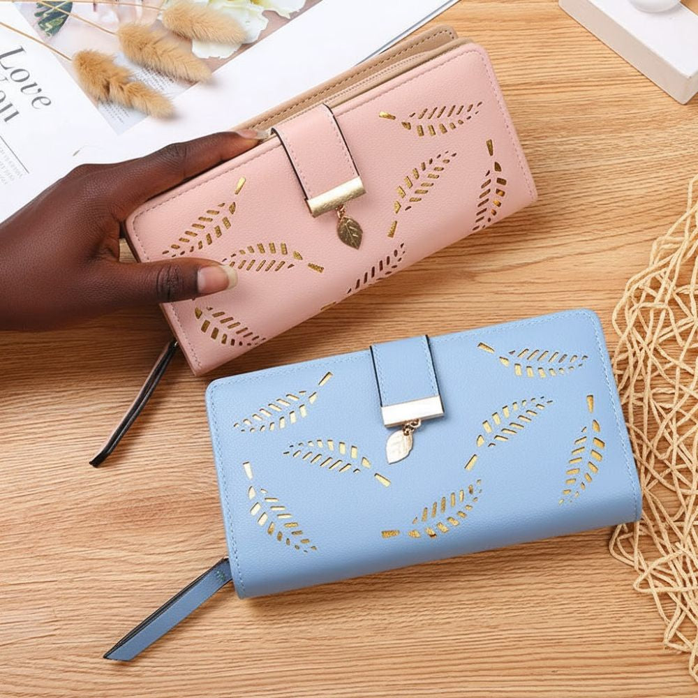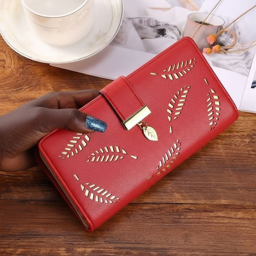 Ce qui capture le regard, c'est son motif délicat de feuilles ajourées. Cette découpe laser précise laisse entrevoir une doublure contrastante (souvent dorée), ajoutant une touche de lumière et de luxe. Le tout est rehaussé d'une élégante fermeture à boucle/pression, ornée d'un petit pendentif en forme de feuille, pour un rappel subtil et chic.